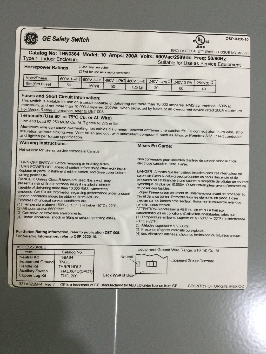 GE THN3363 Safety Switch, Model 10, 200A, 600VAC, 250Vdc, 50/60 Hz Type 1 indoor enclosure