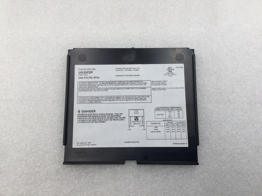 Midwest U035F2P 30 Amp 120/240V Dead Front Only This dead front assembly provides a protective barrier for your electrical panel, meeting safety standards for exposed installations. Rated for 30 amps at 120/240 volts, it's engineered for reliable performance in residential and light commercial applications. The dead front design shields live components from accidental contact, reducing shock hazards and ensuring code compliance. Constructed with durable materials to withstand repeated access cycles, this component integrates seamlessly into Midwest electrical