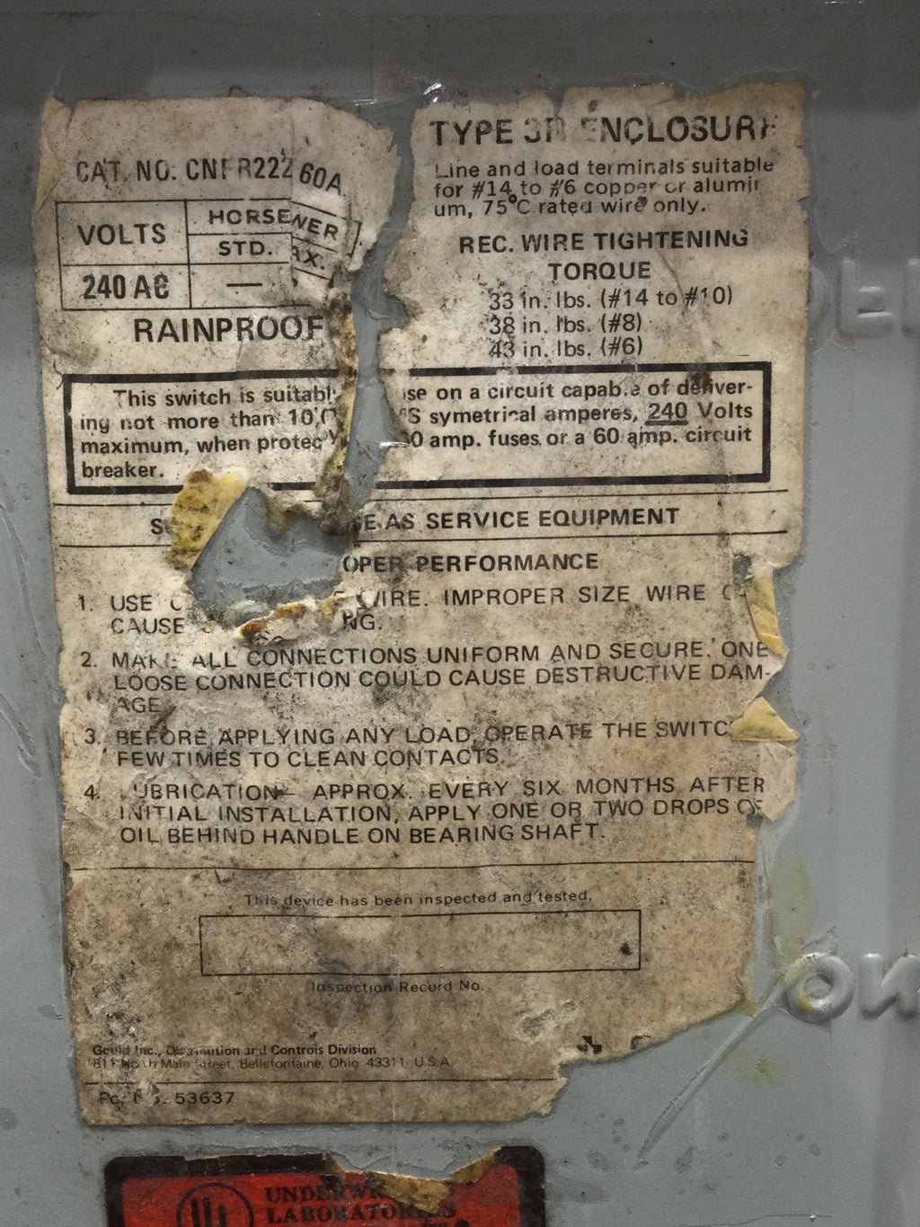 Gould ITE CNFR222 60 Amp, 240-Volt, non-fusible safety switch