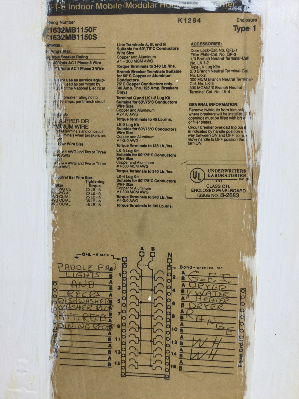 Gould/ITE M1632MB1150F/S Indoor Load Center 150 Amp 120/240V 1 Phase 3 Wire 18 Space Cover 28" x 15.5"