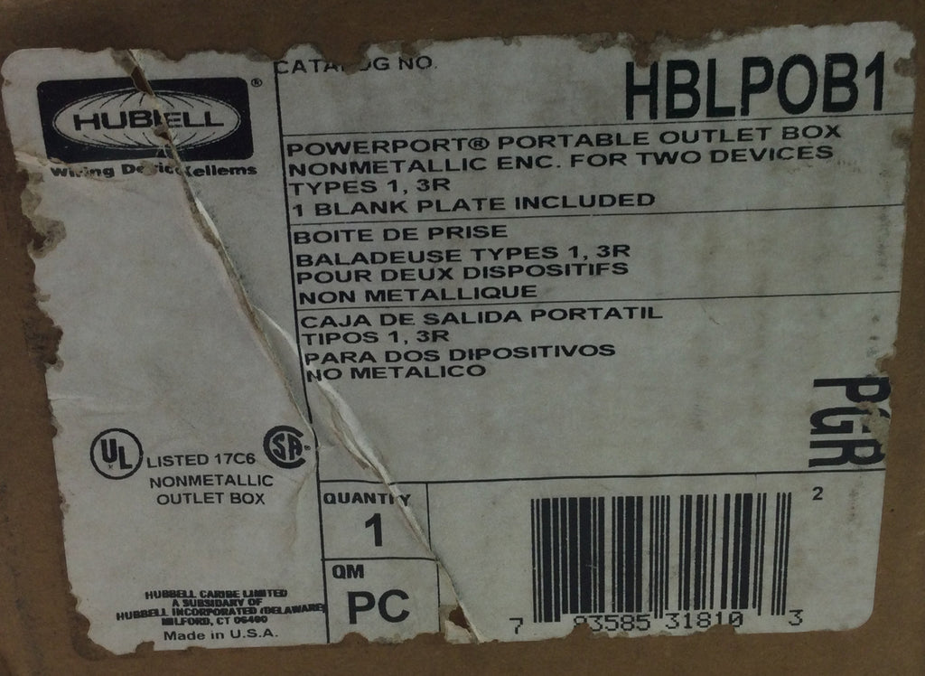 The Hubbell HBLP0B1 PowerPort Weatherproof Portable Outlet Box provides secure, weather-resistant power access for temporary or outdoor applications. Its rugged design safeguards electrical connections from moisture and dust, ensuring reliable operation in demanding environments.