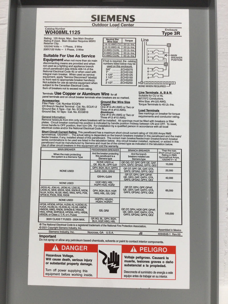 The Siemens W0408ML1125 is a 125 Amp, 4-space enclosure cover designed for 120/240V panels. Measuring 12" x 6 3/8", it provides a precise fit and durable protection, ensuring safety and reliability for your electrical installations. Ideal for maintenance or replacement in compatible Siemens panel setups.