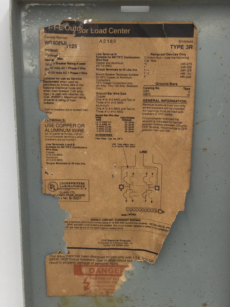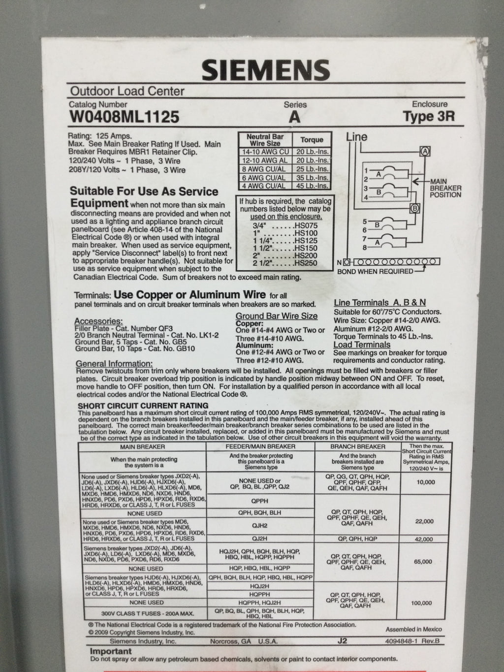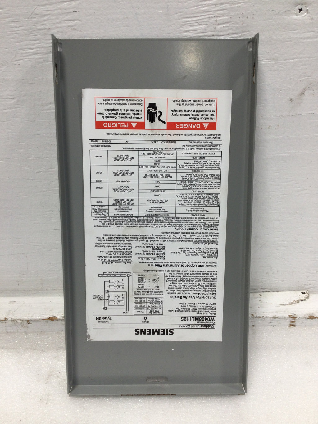 Siemens W0408ML1125 125A 4 Space 120/240V Enclosure Cover Only 12" x 6 3/8"