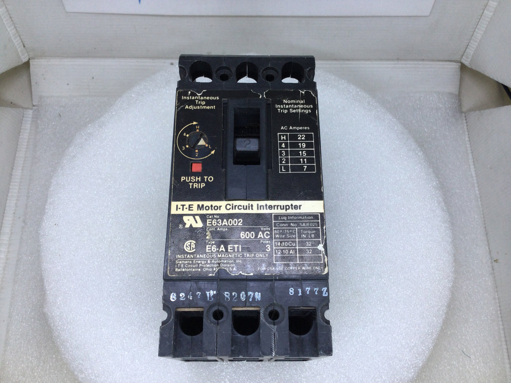 ITE E63A002 2 Amp 3 Pole 600V Motor Circuit Breaker