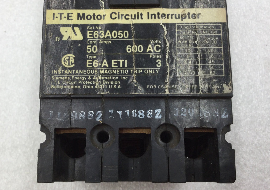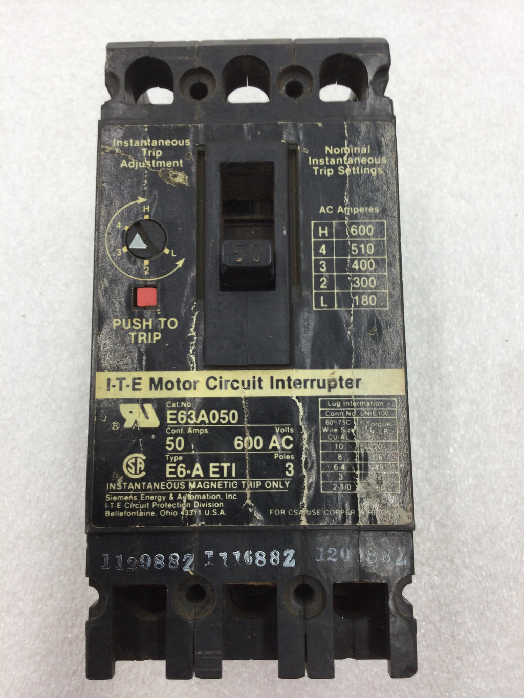 ITE E63A050 50 Amp 3 Pole 600 VAC Motor Circuit Interrupter with Shunt Trip and Without Lugs