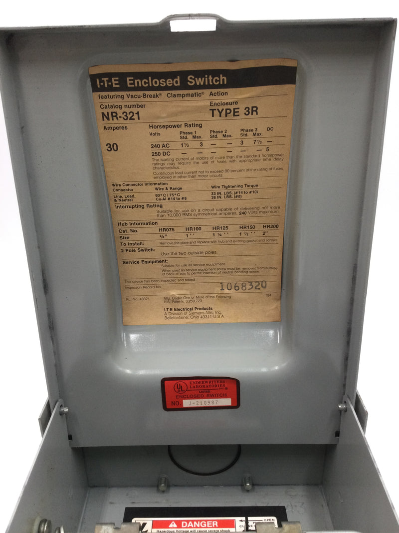ITE General Duty Safety Switch NR321 30 Amp 240 Volt Fusible 3R Enclosure
