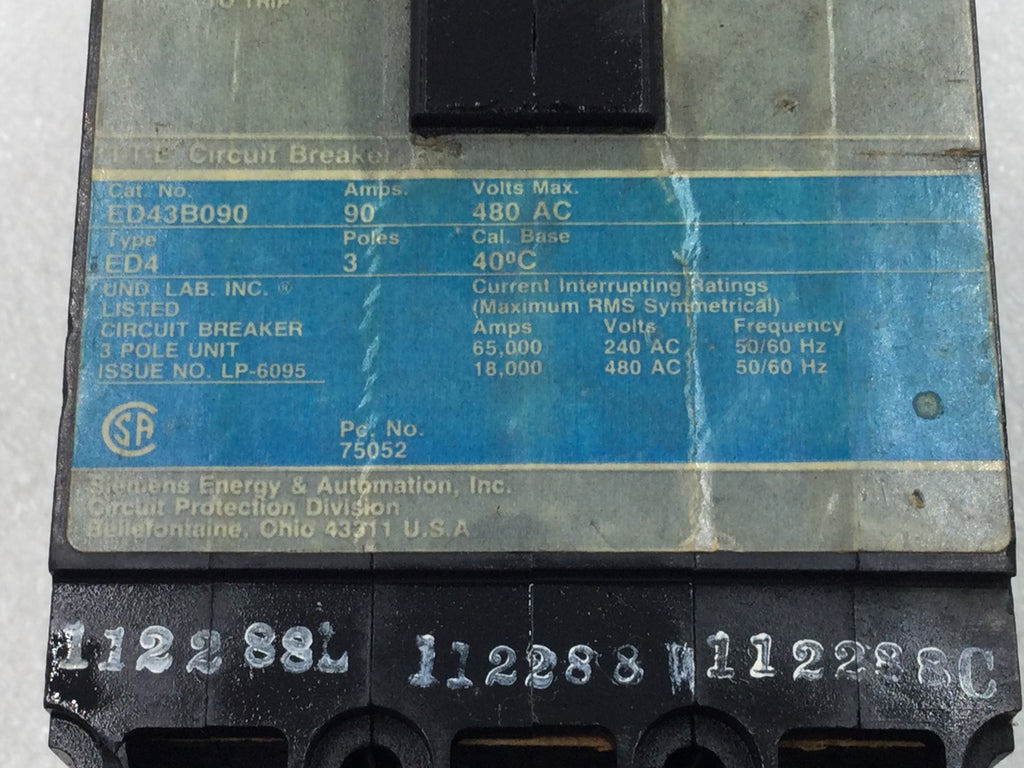 ITE/Siemens ED43B090 90 Amp 3 Pole 480V Circuit Breaker - Cosmetic Flaw