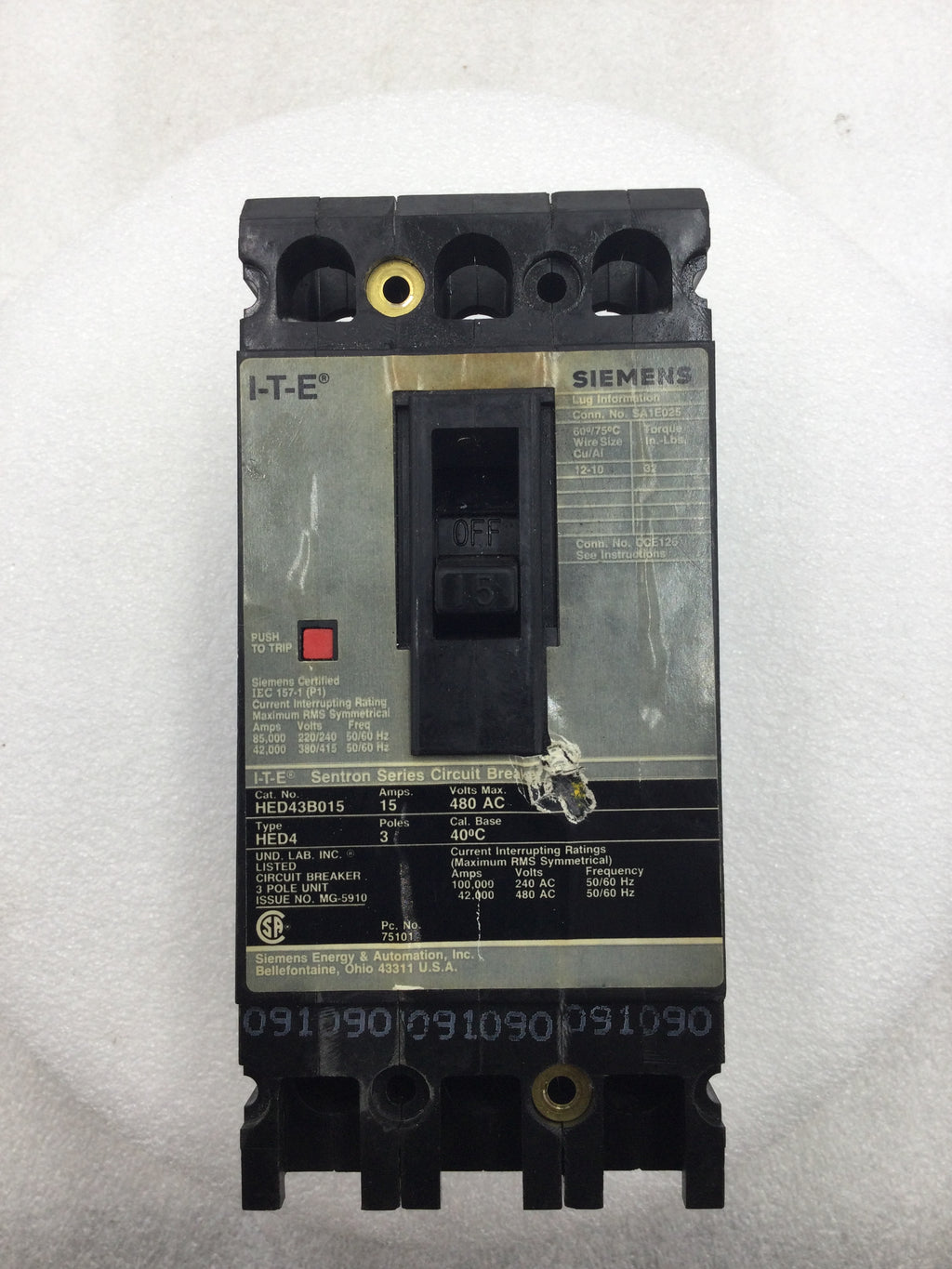 ITE Siemens HED43B015 15 Amp 3 Pole 480 VAC Circuit Breaker