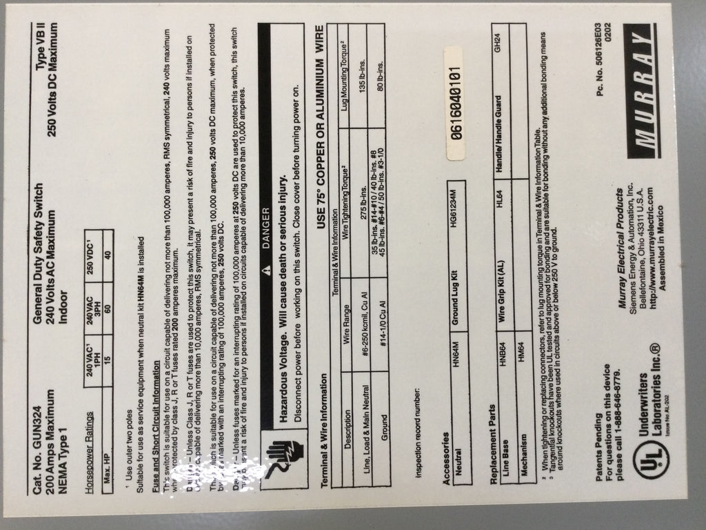 Murray GUN324 New Open Box, 3Phase, 200A, 240VAC, 250VDC, NEMA Type1 Indoor, Non-Fused, Safety Switch