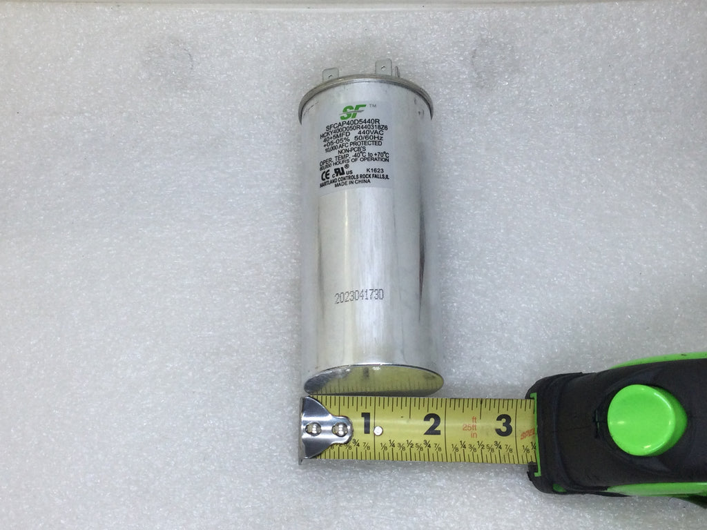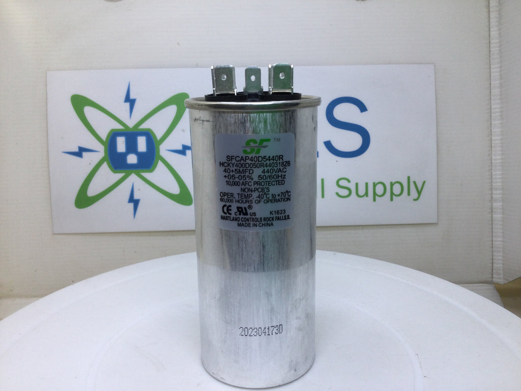 This Hartland Control/Service First SFCAP40D5440R capacitor has a capacitance of 40+5MFD with a voltage rating of 440VAC. It operates at a frequency of 50/60Hz with an accuracy of +/-5%. Upgrade your system with this reliable and efficient run capacitor.