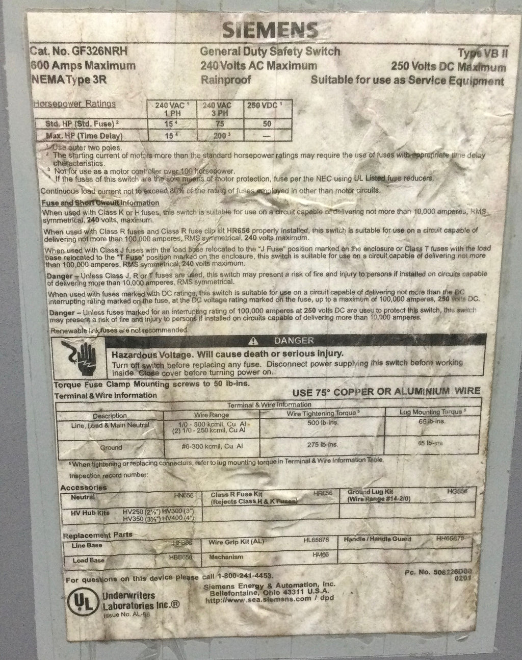 Siemens GF326NRH 600 Amp 4 Pole 250V Safety Switch/ Disconnect
