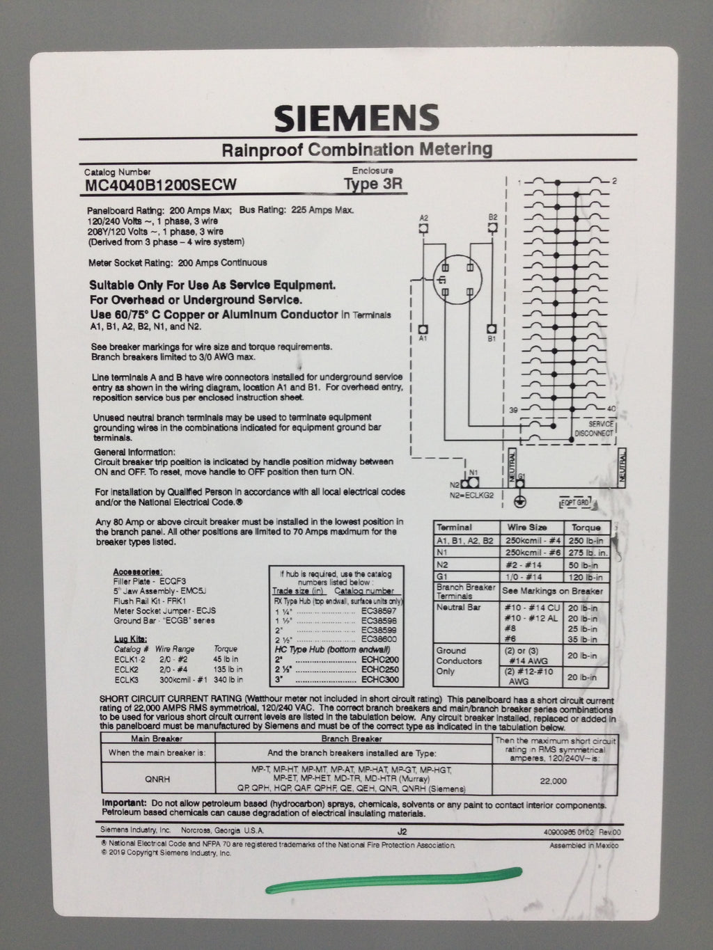 Siemens MC4040B1200SECW 200 Amp 40 Space Hinged Cover Only 32 1/8" x 13 3/4"