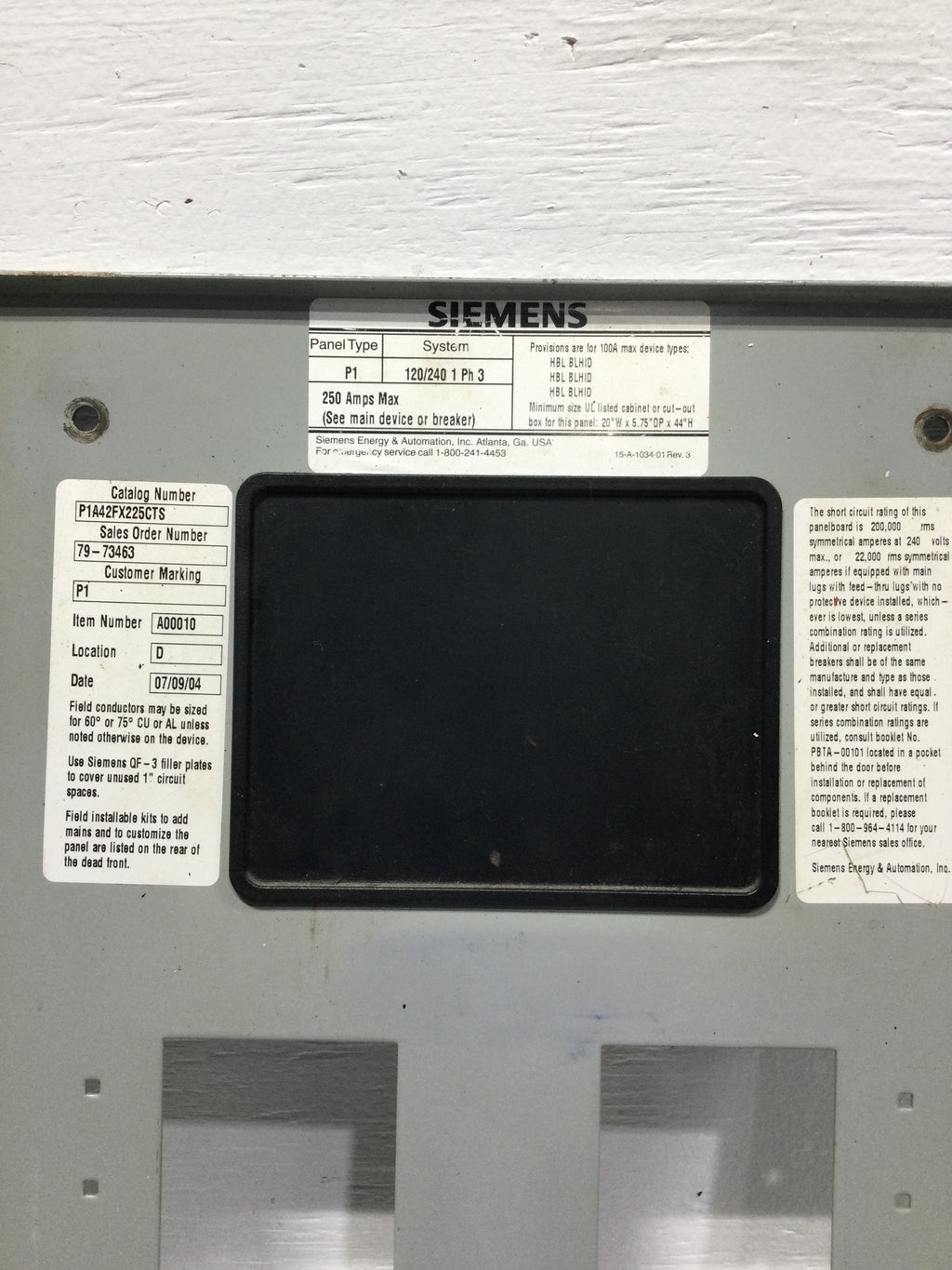 Siemens P1A42FX225CTS 225 Amp 42 Space 120/240V Dead Front w/Main 36" x 12 3/4"