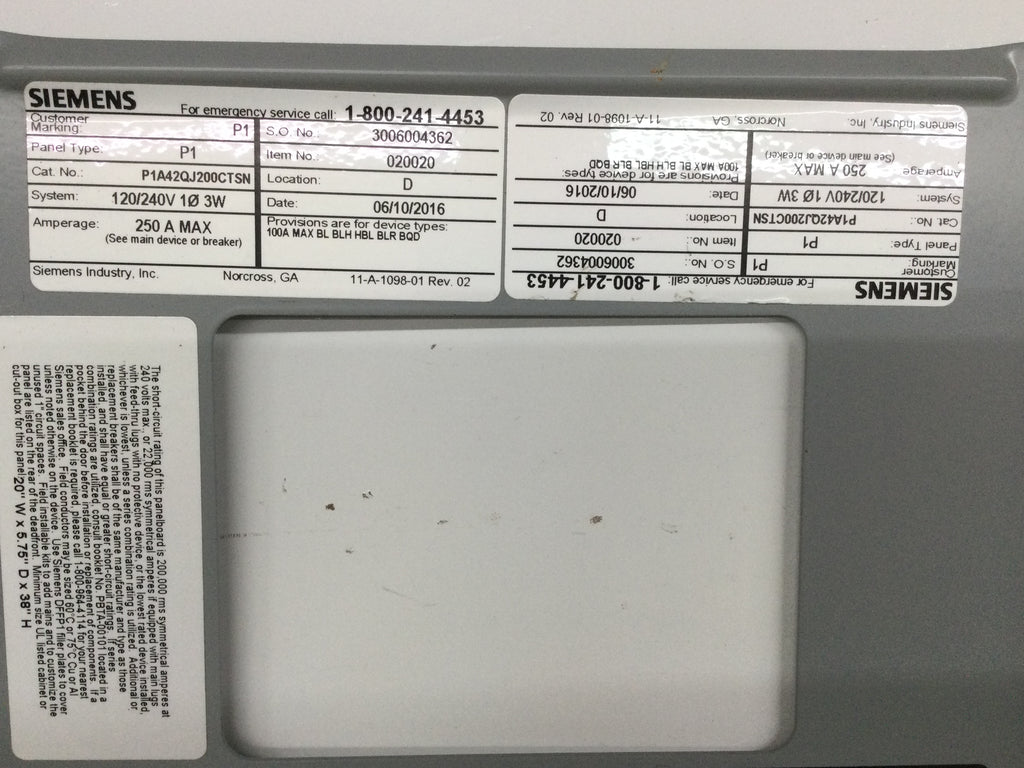 Siemens P1A42QJ200CTSN Dead Front Only with Main 250 Amp 120/240V 30 3/4" x 12 1/2"