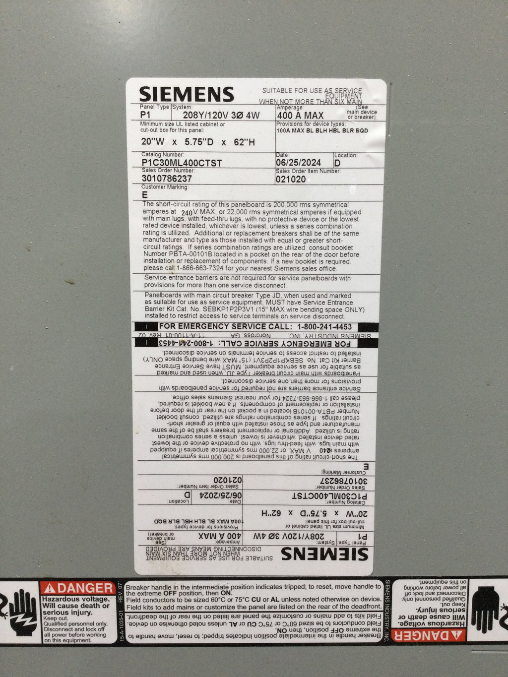 Siemens P1C30ML400CTST 400 Amp 240/208Y/120V 3 Phase 4 Wire MLO Panel Board 20" x 5.75" x 62"