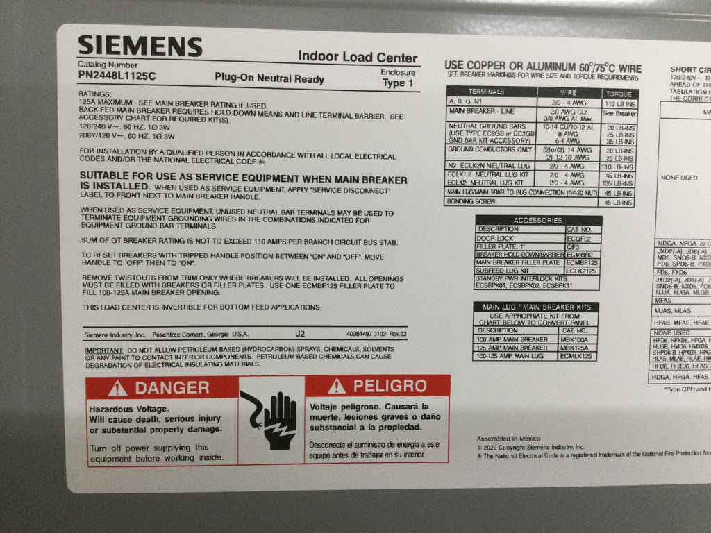 The Siemens PN2448L1125C Indoor Load Center Panel/Door is a professional-grade product designed for 24 spaces and a maximum amperage of 125 amps. It is suitable for single-phase, 3-wire systems, with a voltage of 120/240V. The door measures 25 1/8" x 15 1/2” for a secure fit.