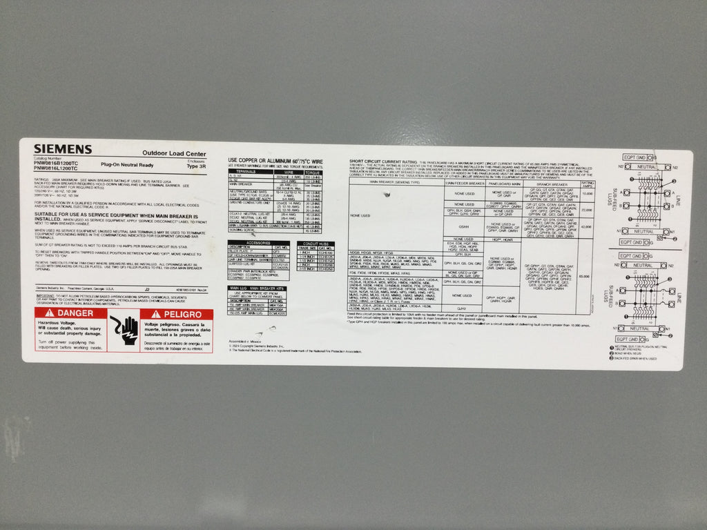 The Siemens PNW0816L1200TC is a robust 200 Amp panel designed for 120/240V systems. Featuring 8 spaces within a 25" x 14 5/8" enclosure, it offers a compact yet efficient solution for electrical distribution. Ideal for residential or light commercial use, this panel ensures reliable circuit protection and organized wiring.