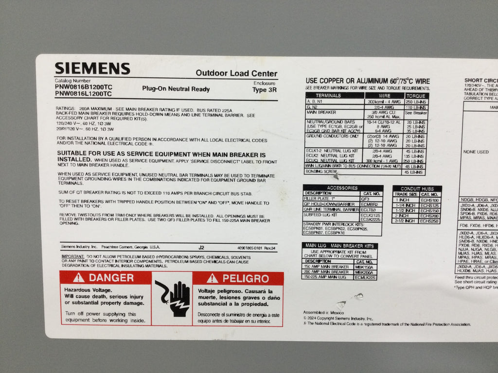 Siemens PNW0816L1200TC 200 Amp 8 Space 120/240V Enclosure Panel 25" x 14 5/8"