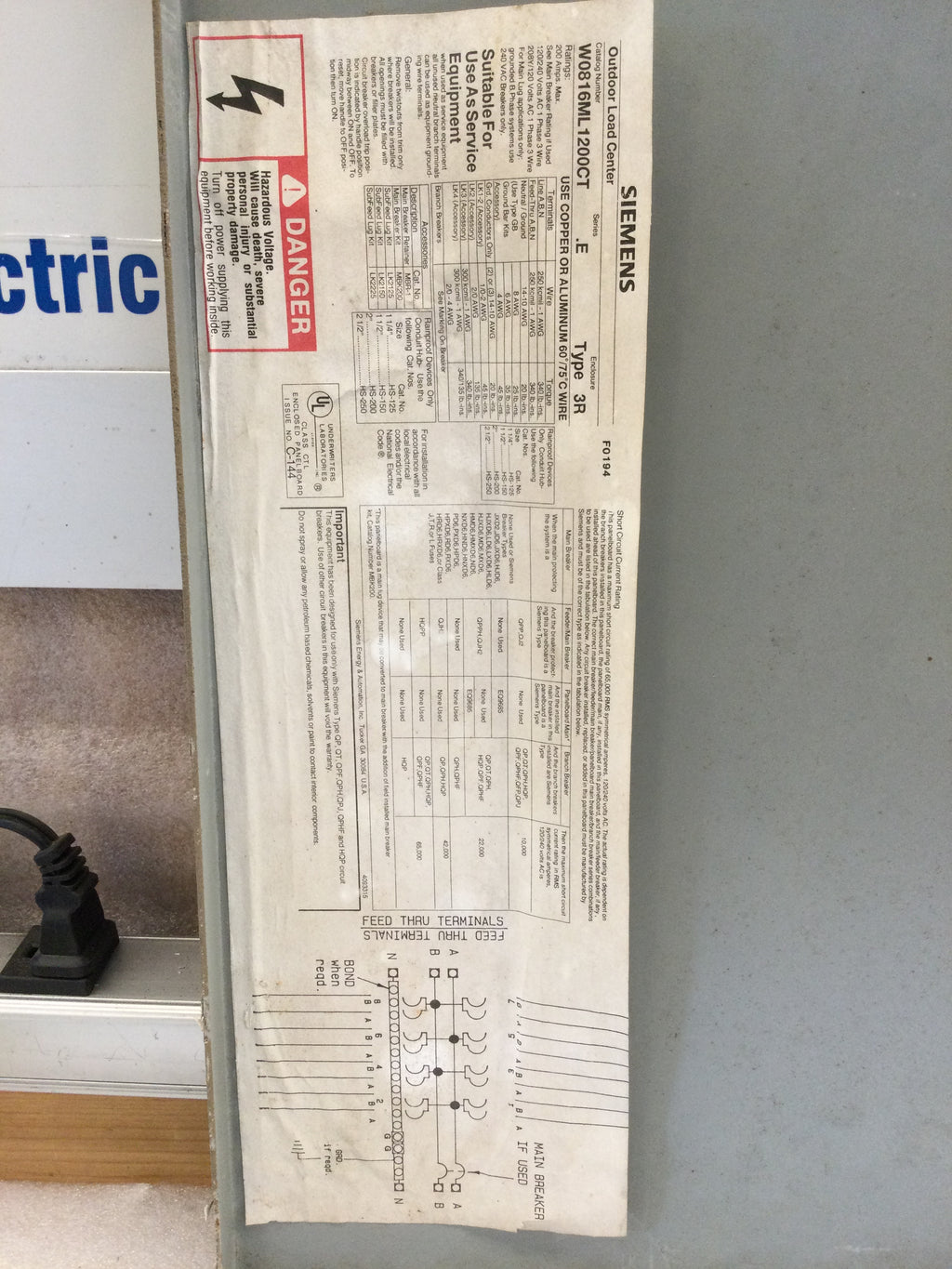 Siemens W0816ML1200CT 200 Amp 120/240v Series E Type 3R 1 Phase 3 Wire Outdoor Load Center Cover 28" x 14.5"