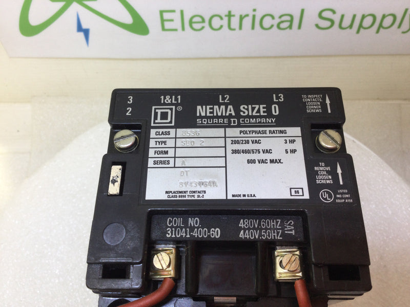 Square D 8536 SB0-2 Size 0 600V 3 Phase Contactor 480V Coil w/Overload Relay
