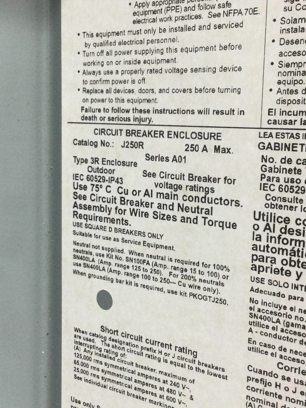 Square D J250R Circuit Breaker Enclosure NEMA 3R