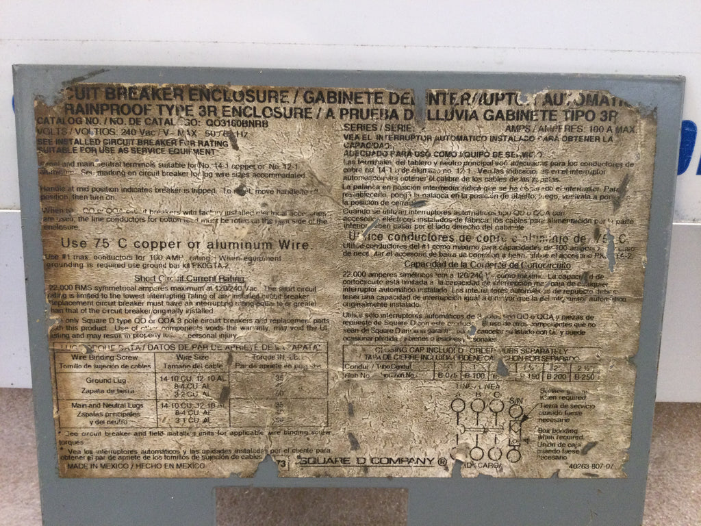 Square D QO3160BNRB 100 Amp 240v Type 3R Dead Front Only 12" x 7"