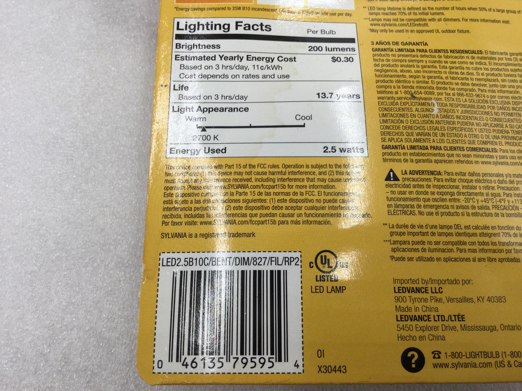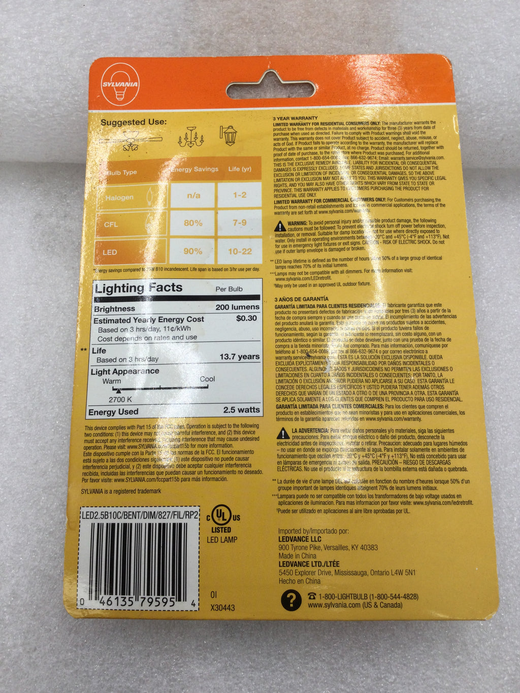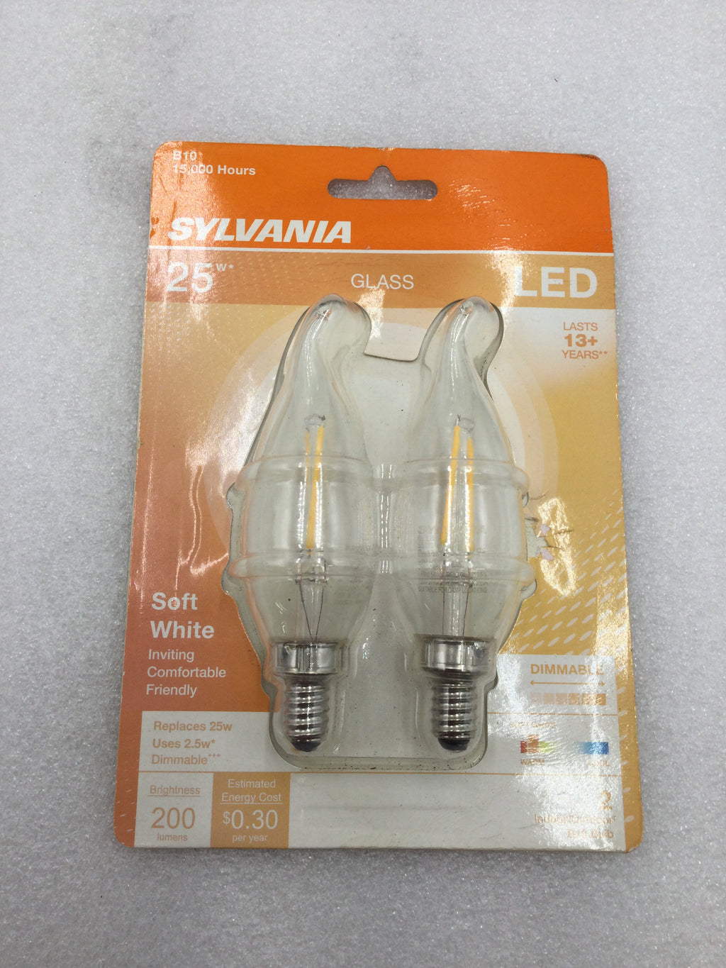 Illuminate your space with Sylvania's X30443 LED Flame Tip Decorative Lamp. With 2.5 watts of power, it provides a dimmable and energy-efficient lighting solution at 120 volts. The unique flame tip design adds a touch of elegance and ambiance to any room.