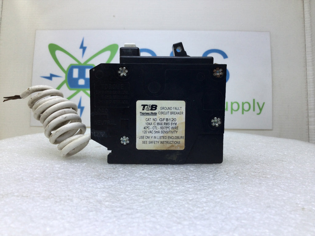 The Thomas & Betts GFB120 is a 20 Amp, 1 Pole, 120V circuit breaker equipped with a built-in Ground Fault Interrupter (GFI). Designed for reliable protection, it safeguards electrical circuits by quickly interrupting power during ground faults, reducing the risk of electrical shock and equipment damage. Ideal for residential and commercial applications, this breaker ensures enhanced safety and compliance with electrical codes. Its compact design allows easy installation in standard breaker panels, providing dependable performance for critical circuit protection.