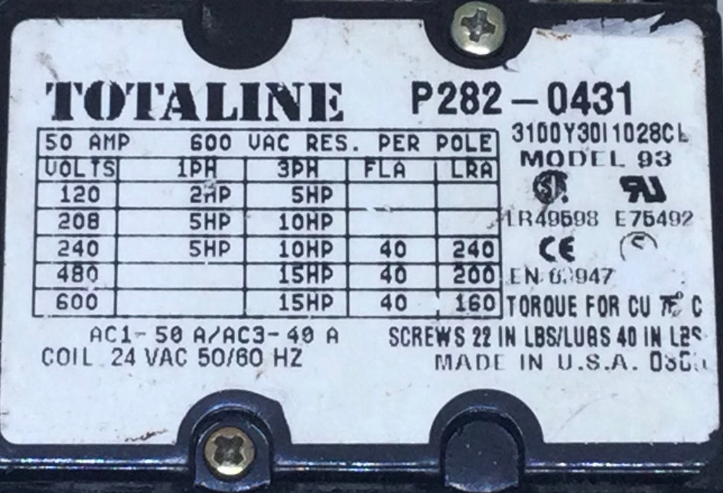 Totaline P282-0431 40 Amp 3 Pole 600V Model 93 Contactor Coil