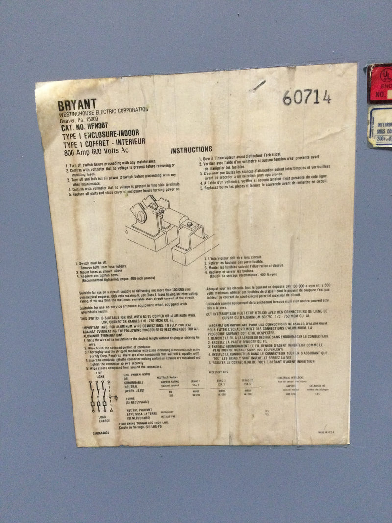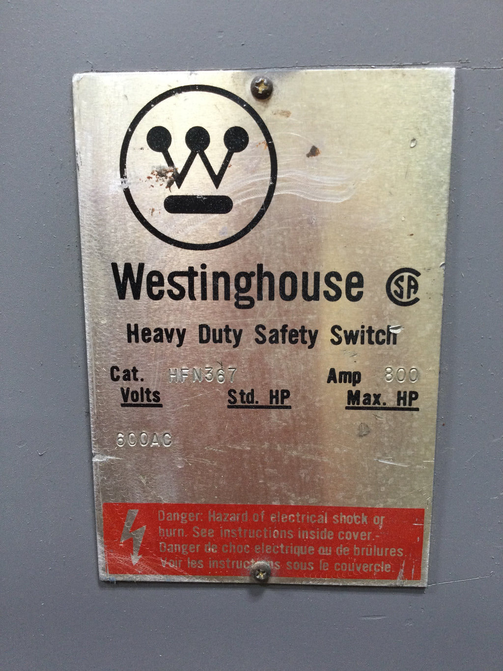 Westinghouse/Bryant HFN367 800A 3P 600V Fusible HD Safety Switch 65 1/2" x 38"