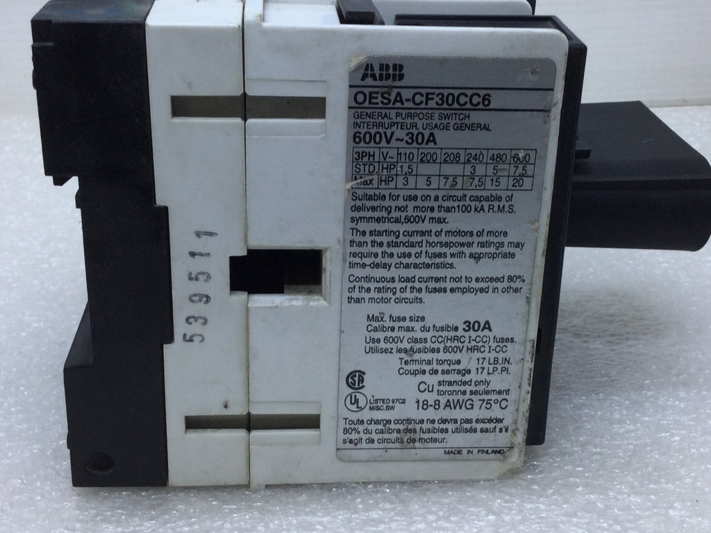 ABB OESA-CF30CC6 3 Phase 600V 30 Amp General Purpose Switch Interrupteur, Fusible, Max Fuse Size 30A, Class CC Fuses