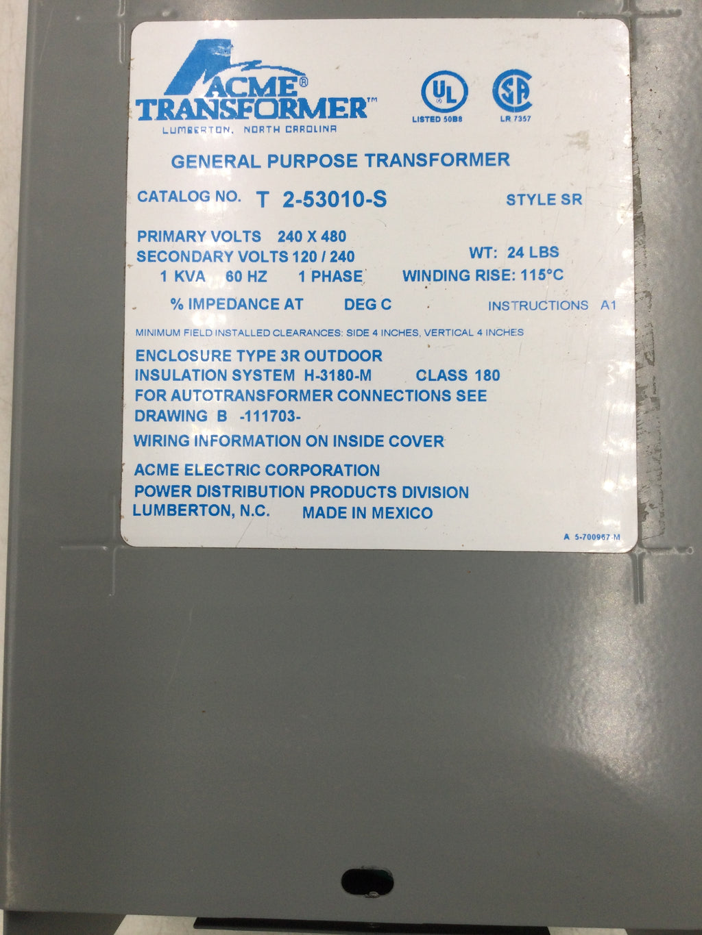 Acme Transformer T 2-53010-S 1 KVA 240/480 VAC Input 120/240 VAC Output 1 Phase 60 HZ