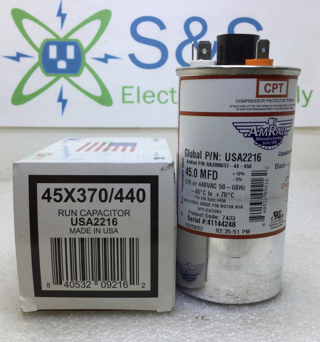 The Amrad USA2216 capacitor offers a 45.0 MFD rating with a tolerance of +10%/-5%, designed for reliable operation at 370/440VAC and 50/60Hz. Ideal for industrial and electrical applications requiring stable performance under variable voltage conditions, this capacitor ensures efficient energy storage and smooth operation of motors and other equipment.