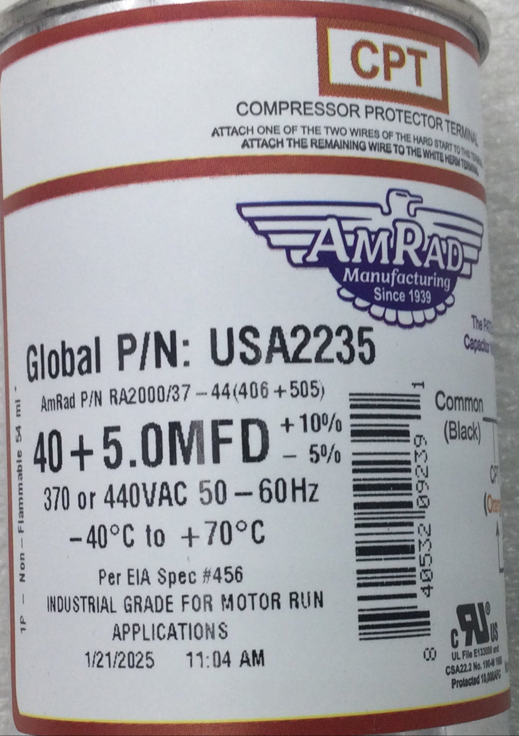 Amrad USA2235 40+5.0MFD +10%/-5% 370/440V 50/60Hz Capacitor w/CPT