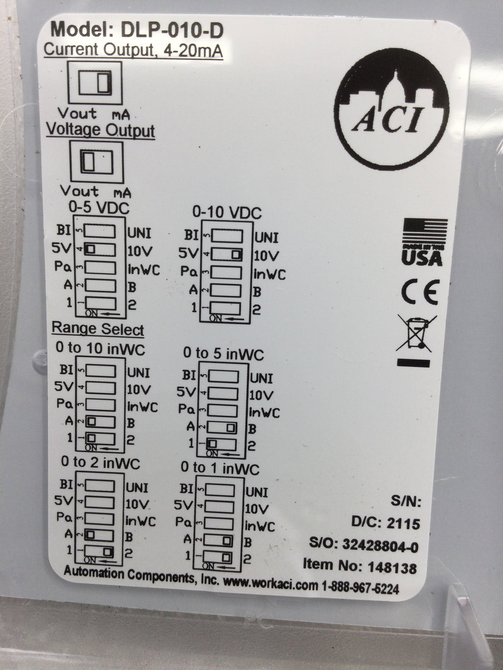 Automation Components, Inc. DLP-010-D Item # 148138 Differential Pressure Sensor