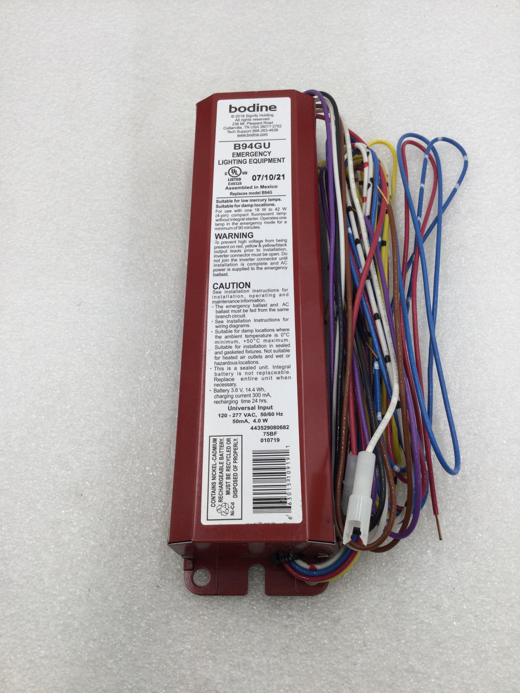 The Philips/Bodine B94GU Fluorescent Emergency Light Ballast is a reliable and powerful emergency lighting solution. With a 120/277 VAC input and 3.6V battery output, it ensures consistent performance during power outages. Trust in Philips/Bodine for a dependable and efficient emergency lighting system.