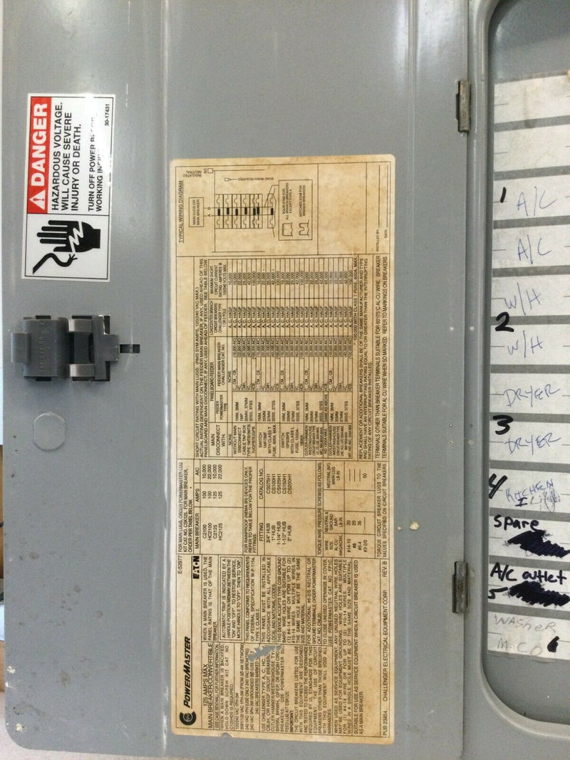 CHALLENGER POWERMASTER 125 AMP  120/240V 1 PHASE 3 WIRE PANEL