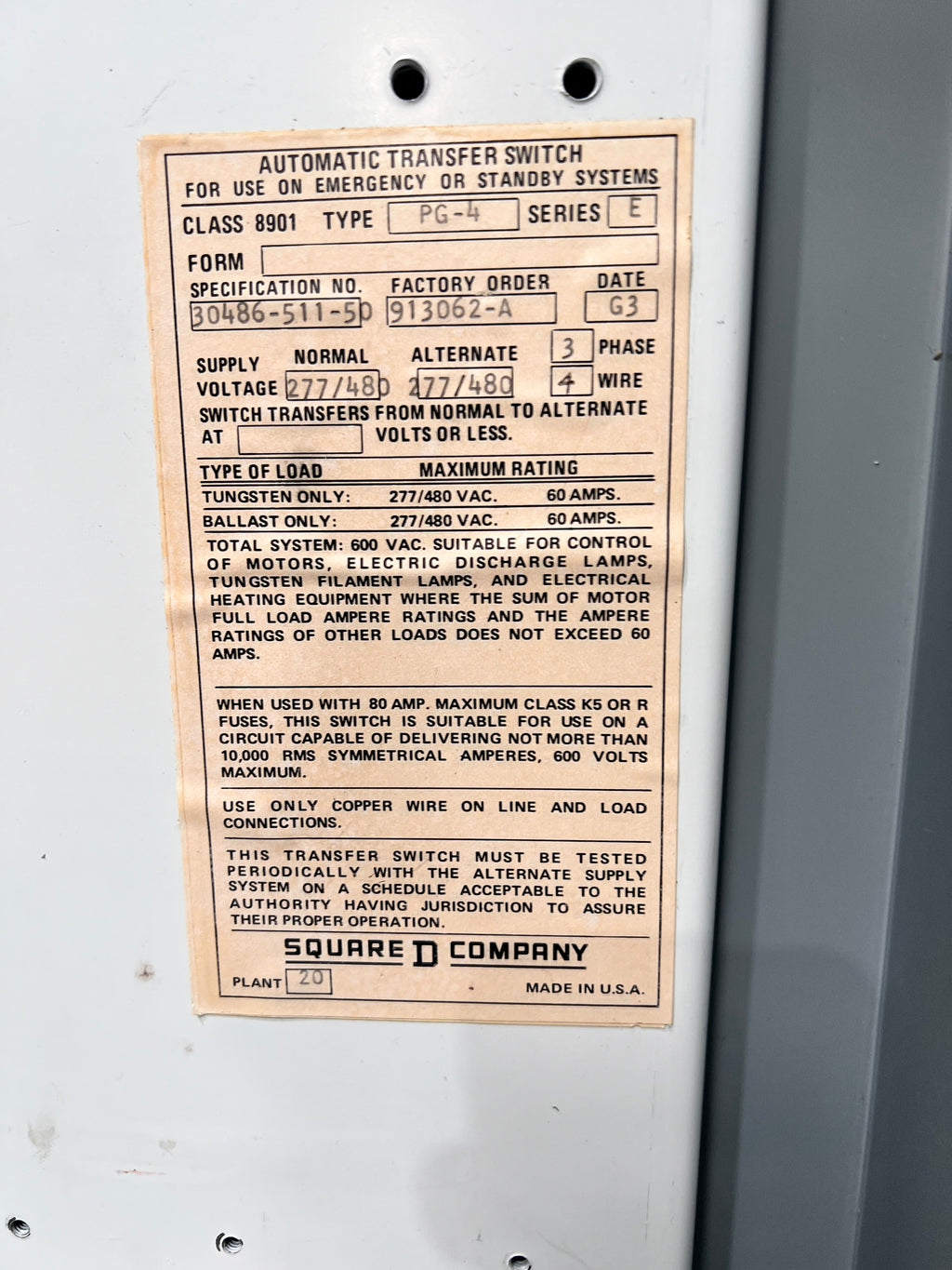 Square D Class 8901 Type PG-4 Series E Transfer Switch Enclosure 277-480v