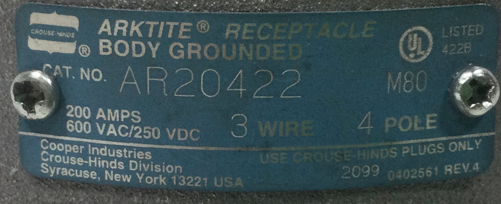 Crouse-Hinds AR20422 200 Amp 3W 4 Pole 600V ARKtite Receptacle/Service Outlet