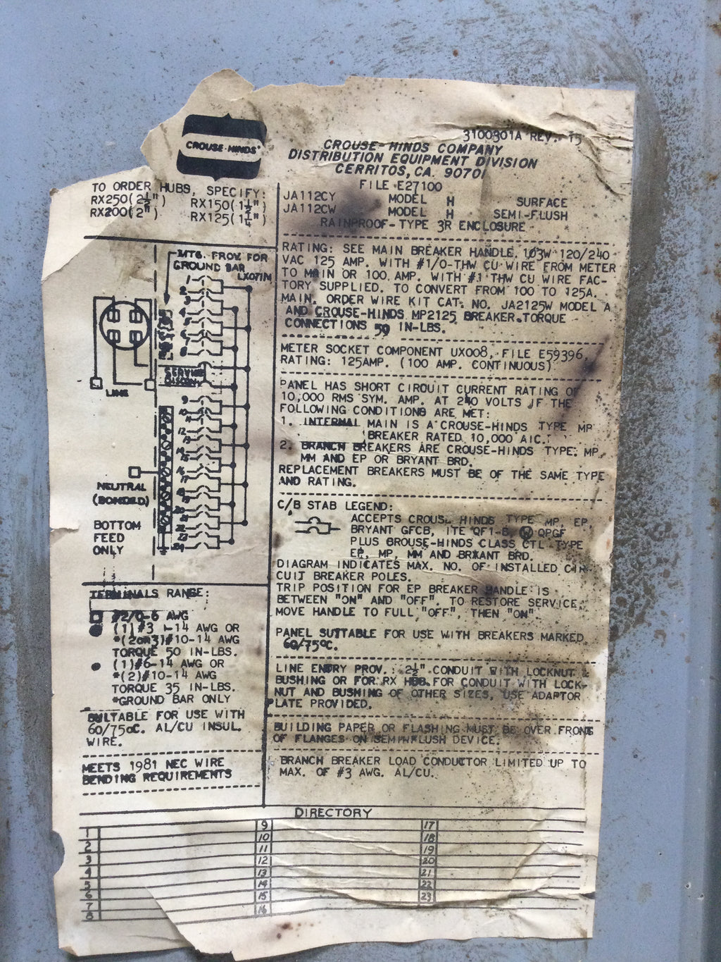Crouse-Hinds JA-112CY 125 Amp Nema 3R 120/240V Cover Only 21 1/8" x 7 1/4"