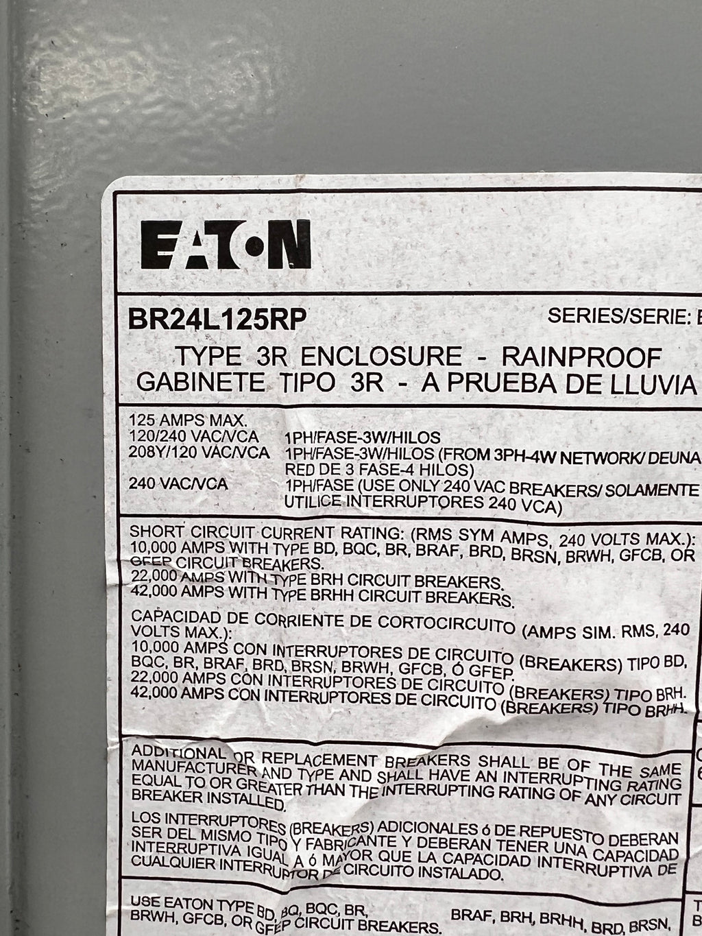 The BR24L125RP is an Eaton BR main lug loadcenter designed for distributing power to individual circuits. Here are the specifications for this loadcenter: