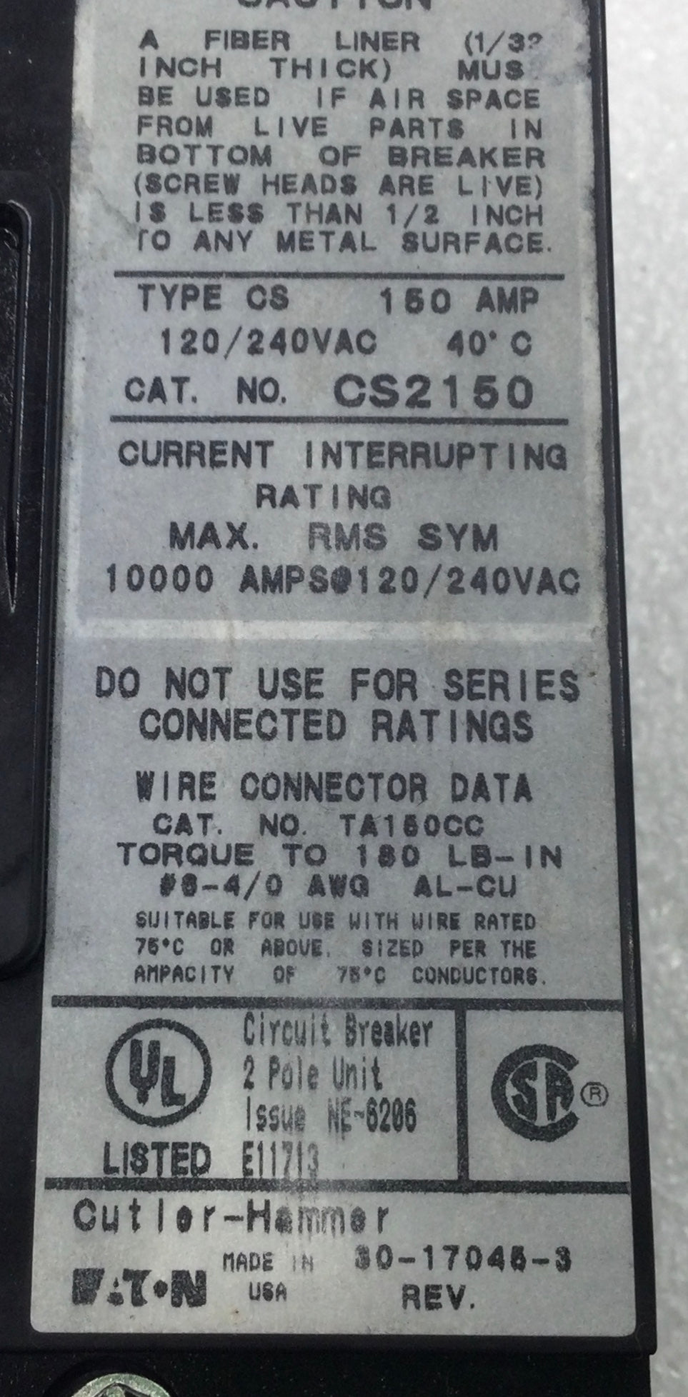 Cutler-Hammer CS2150 150 Amp 2-Pole 240V Circuit Breaker