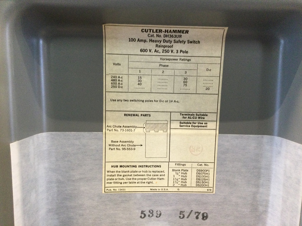 Cutler Hammer Dh363ur 100 Amp Heavy Duty Safety Switch 3 Pole 600v Ac250v