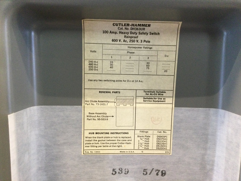 Cutler Hammer DH363UR 100 Amp Heavy Duty Rainproof Safety Switch 3 Pole 600v Ac250v