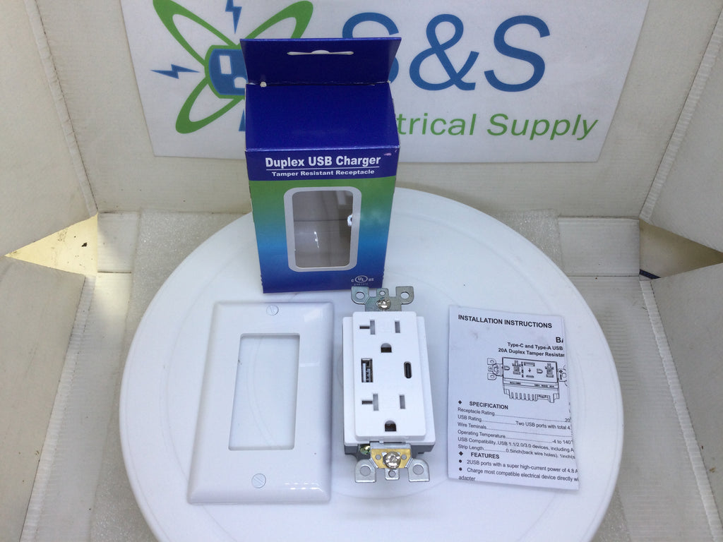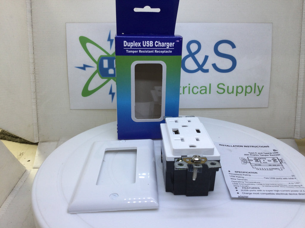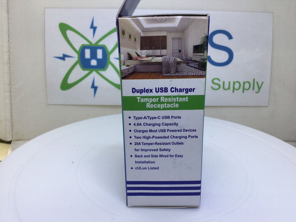 Duplex USB Charger 20A 125VAC Tamper Resistant Receptacle With type-A/Type-C USB Ports 5VDC 4.8A Charging Cap