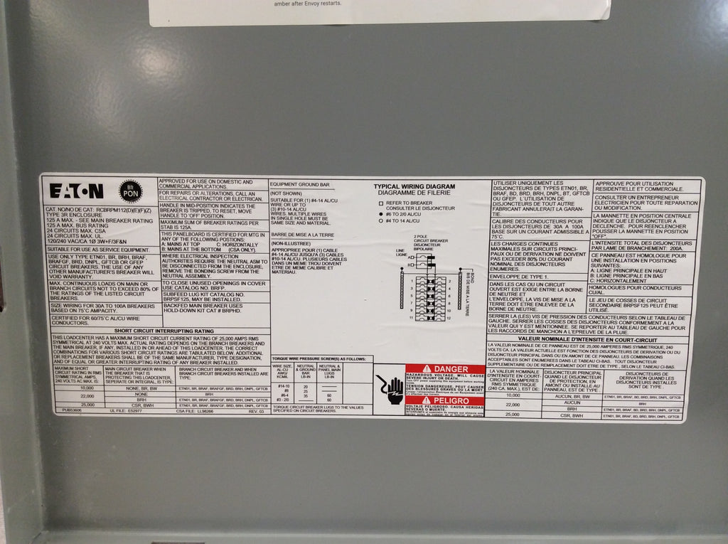 Eaton BRP16L125R Single Phase 125A 120/240VAC Type BRP/BR (Nema3R Cover, Hinges, & Latch)