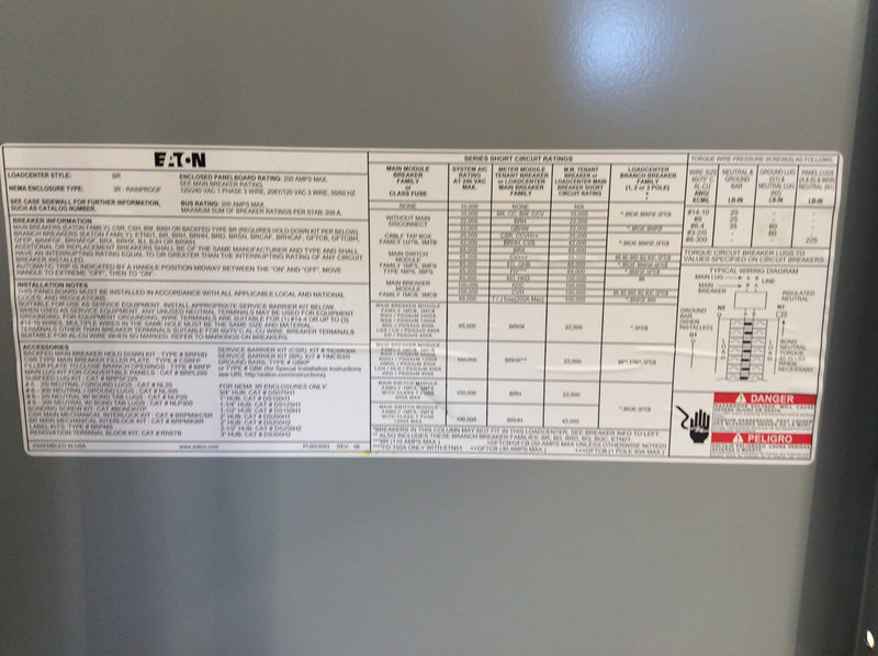 Eaton BRP20N200R 20 Space 200A 120/240VAC Type BR/PON Plug On Neutral Load Center (New In Box)