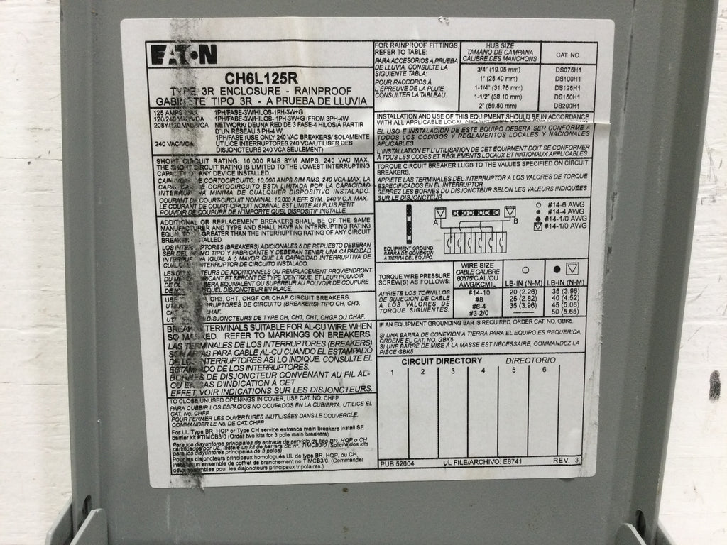 Eaton CH6L125R Main Lug Load Center - 125A - 6 circuits - NEMA 3R