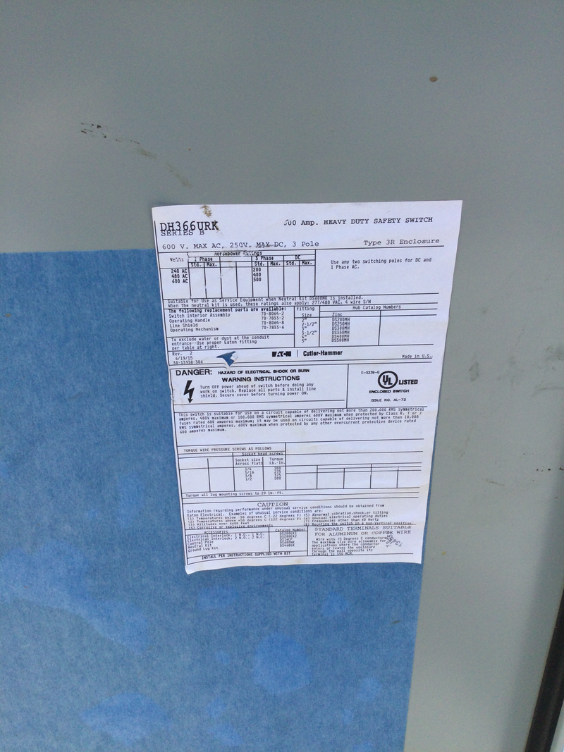 Eaton Corporation Dh366urk Safety Switch, 600 Volt, 60hz, 240vdc, 600 Amp, 3 Pole, Non-Fusible