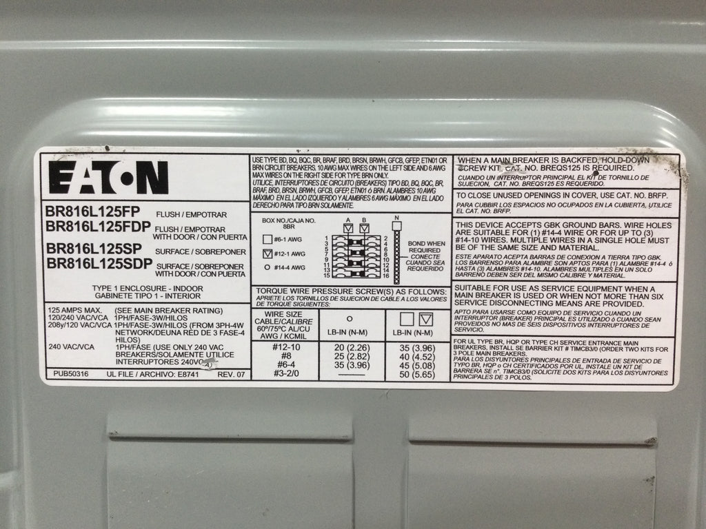 Eaton BR816L125FP 125A 120/240V 8 Space Flush Door 12 1/4" x 14 1/8" - Flaw